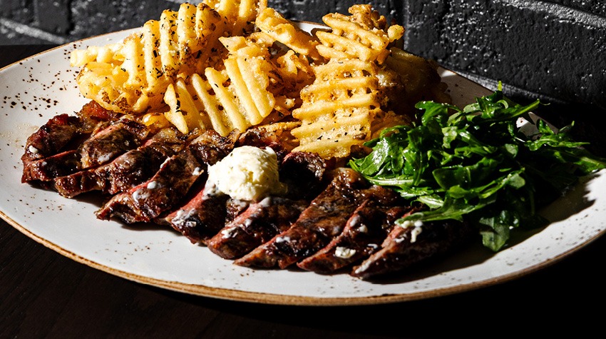 10 oz. New York Strip, Herb Compound Butter, Duck Fat Parmesan Waffle Fries, Citrus Arugula Salad